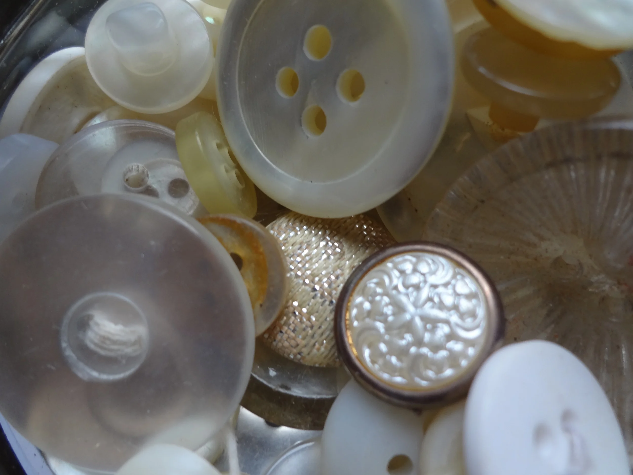 I felt special because she gave me a job, a purpose. I remember meticulously sifting through the buttons trying to find matches for my grandmother, studying all their intricacies and details. There were small black buttons, fancy carved buttons, tortoise shell buttons, plain white buttons, shiny metallic buttons, buttons made out of mother of pearl and every once in a while there would be an object that didn’t quite belong like a pistachio shell.